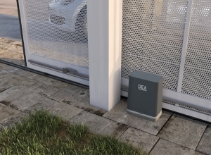 - Пара фотоэлементов безопасности. Устанавливаются по краям проезда навстречу друг другу. Между фотоэлементами проходит инфракрасный невидимый невооружённому глазу луч. При пересечении луча электропривод перестаёт закрывать ворота во избежание раздавливания.