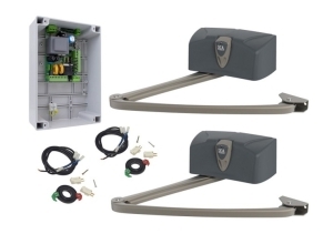 В комплекте: 2 автоматических привода, алюминиевые рычаги, комплект концевых выключателей, блок управления NET230NC.