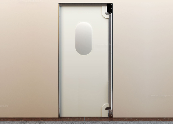В полотно устанавливается смотровое окно овальной формы с размерами 300х600мм, выполненное из ударопрочного поликарбонатного стекла толщиной 15мм. Уникальная технология, разработанная заводом Ирбис, позволяет жестко фиксировать стекло в единую плоскость с полотном, без использования дополнительных элементов крепления, создавая впечатление легкой, целостной конструкции.