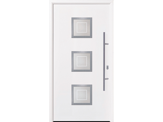 Входная дверь Hormann Thermo 65 Мотив 010. Гладкое стальное полотно. Трехслойное изоляционное остекление: снаружи многослойное безопасное стекло VSG – Float, подвергнутое пескоструйной обработке с прозрачными полосами (квадрат) – внутри однослойное безопасное стекло ESG. Рама остекления из нержавеющей стали. Ручка HB 38-2